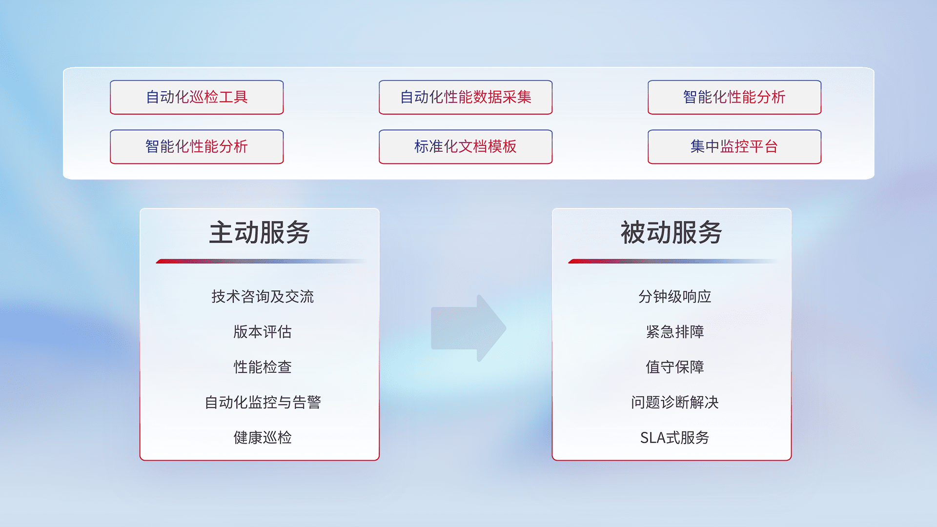 智能化工具和标准化文档,,,保障服务质量,,,提供主动服务(包含技术咨询、、、版本评估、、性能检查、、自动化监控与告警、、、、健康巡检)和被动服务包含(分钟级响应、、、、紧急排障、、、值守保障、、、问题诊断解决、、、、SLA服务)。。。。